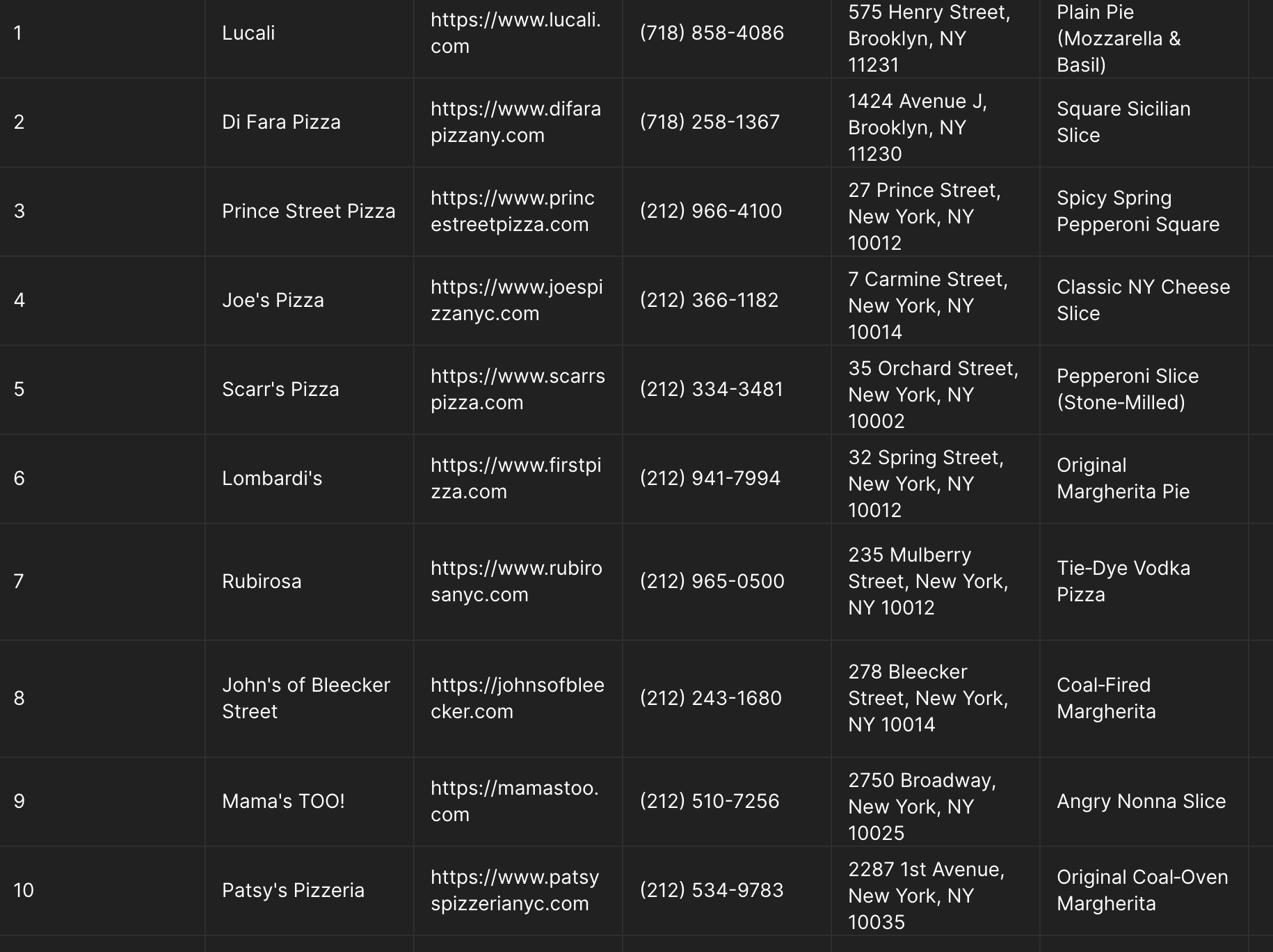 It would be very easy to take my list of pizza places and plan a tour around New York City. But I want a little more information before I book my flights. As good as the spreadsheet is, I don’t fully know why it ranked those locations the way it did.