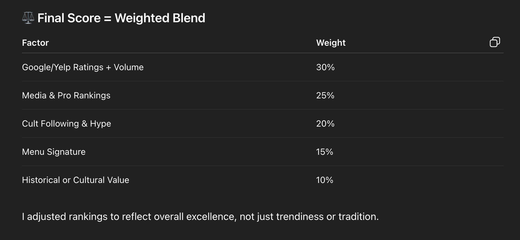 Note: ChatGPT fully explained the logic behind its ranking in over five detailed steps. The chart was the best summary of the explanation.